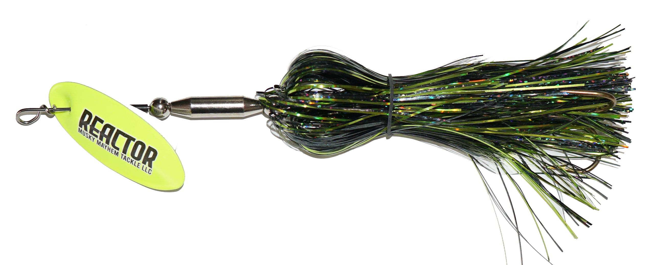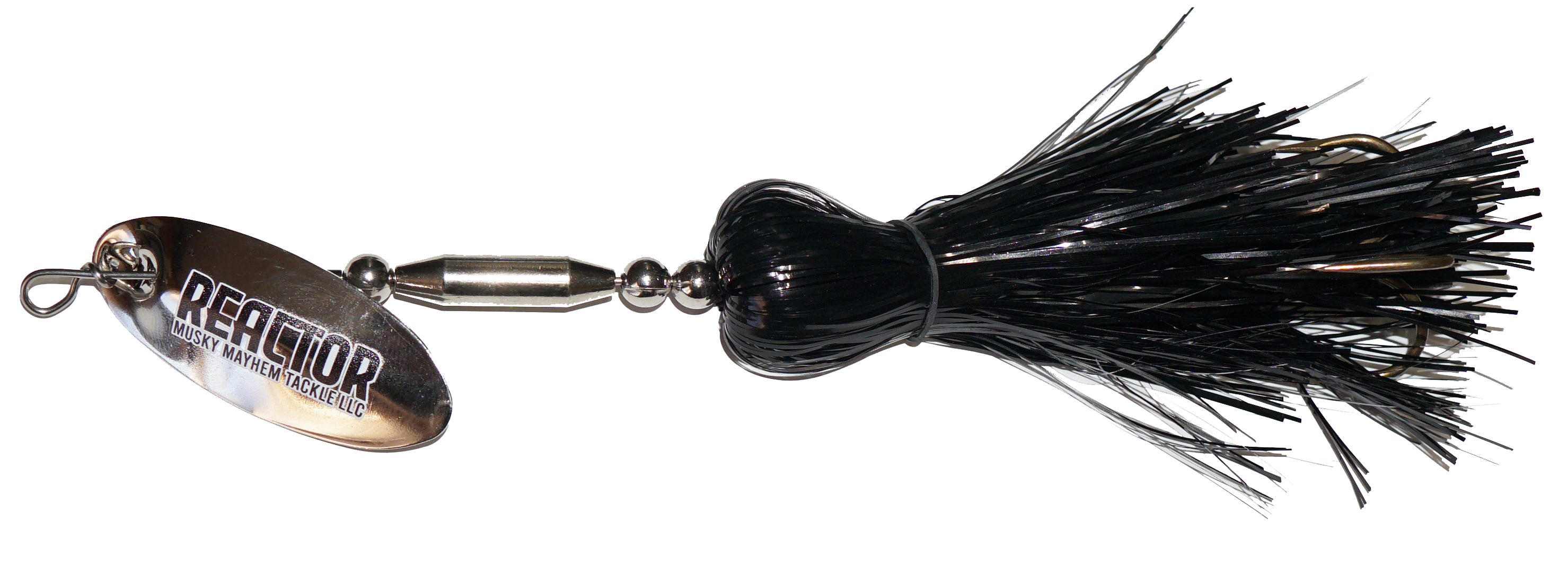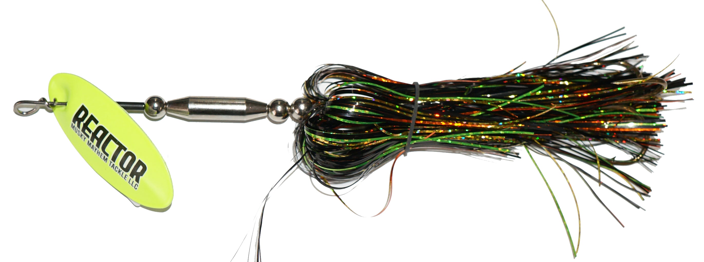 This new speed bucktail from Musky Mayhen features an in-line blade, single oversized treble hook and flashabou skirt. Easy pulling and easy to start blade means covering water just got easier.