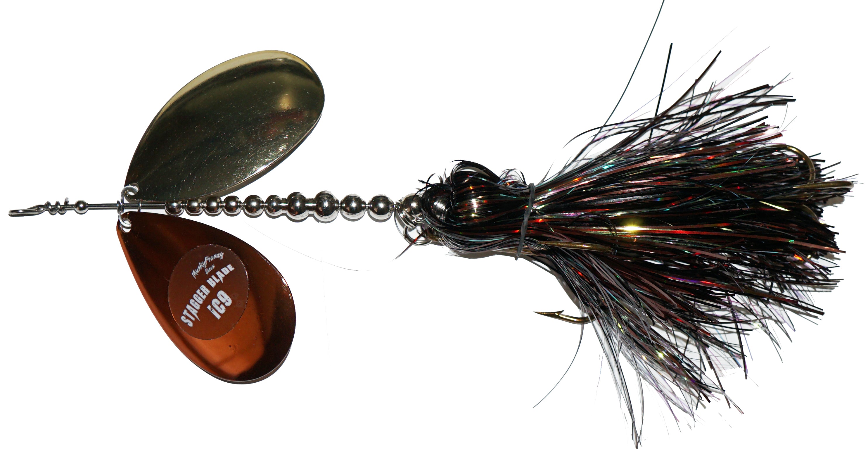 The Stagger Blade Bucktail features a Custom 2 in 1 Clevis, and 2 different blades. The blades start immediately once they hit the water, and can be worked at ANY speed. Combine the grind of the Musky Frenzy custom clevis with the sublte wobble caused by the offset blade combinations and you have one of the most effective bucktails to ever hit the market!