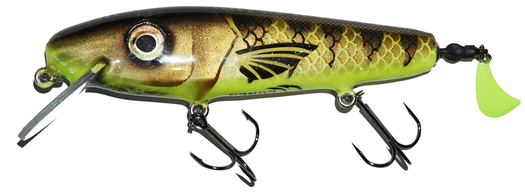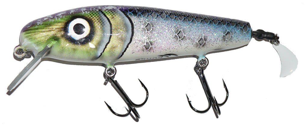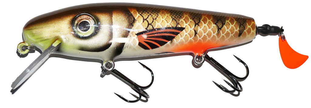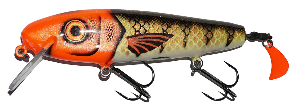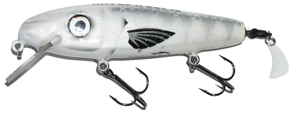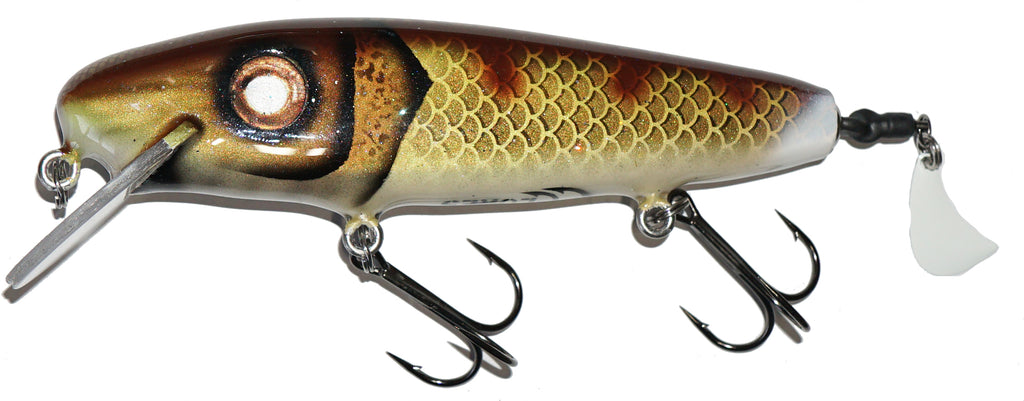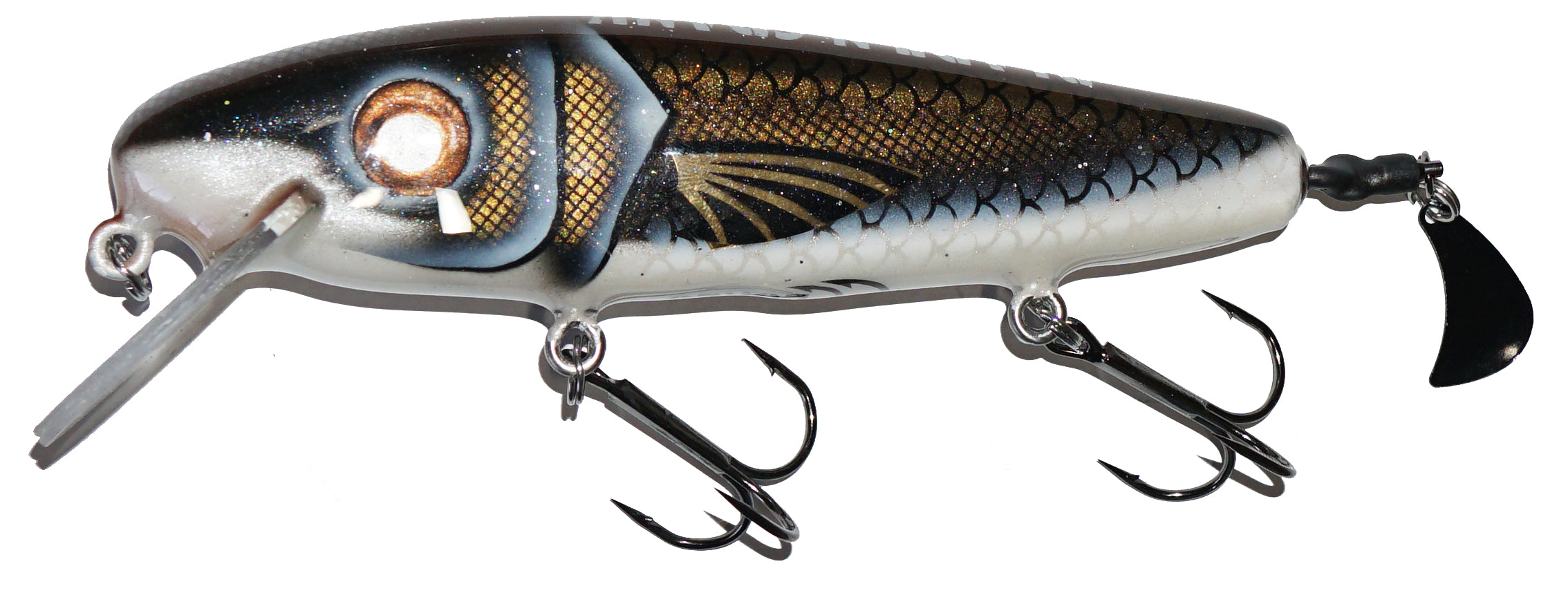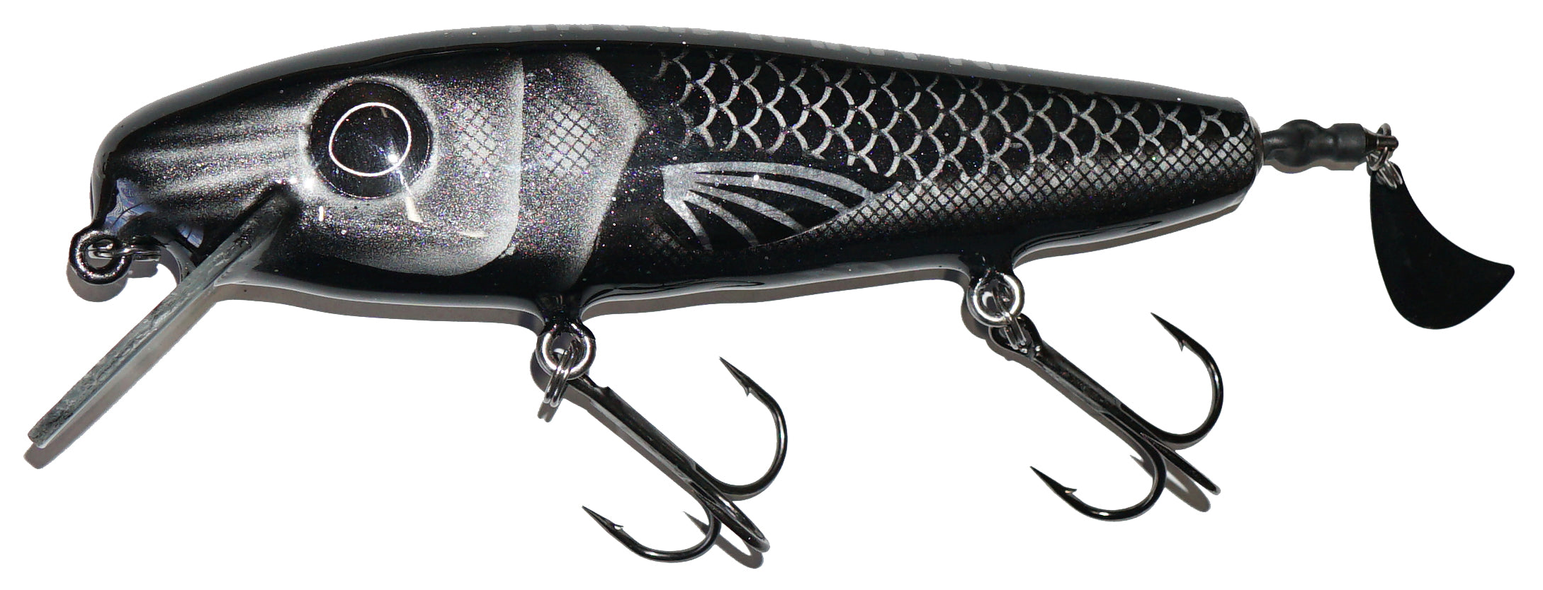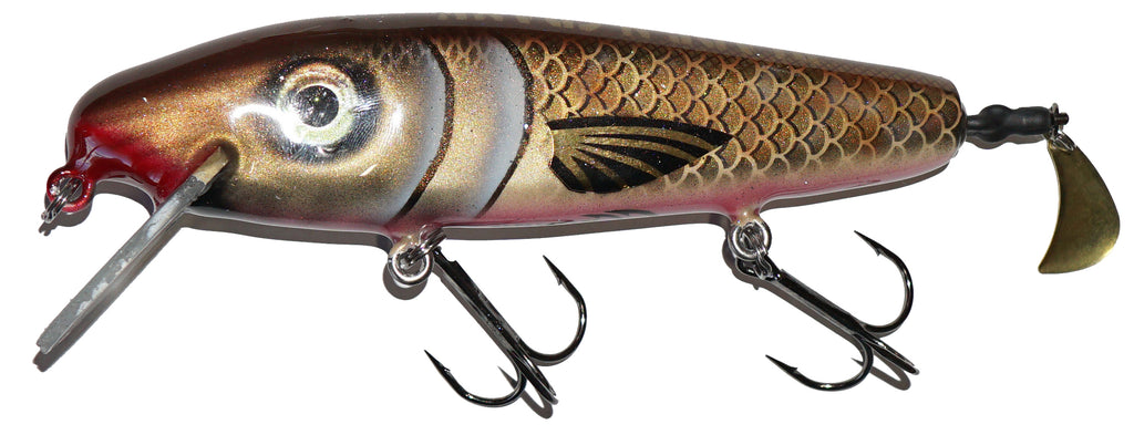 This Crankbait/Jerkbait features 6.5" inches of cedar wood body, new to the market this bait also features a size 5 hatchet blade of the back that flutters at every dive. The blade gives off the most distinctive sound and vibration off the back of each pull of the bait that no fish can resist. This bait also provides strength like no other, 4 epoxy clear coats to give you the strength to put this bait in hundreds of big muskys mouths.