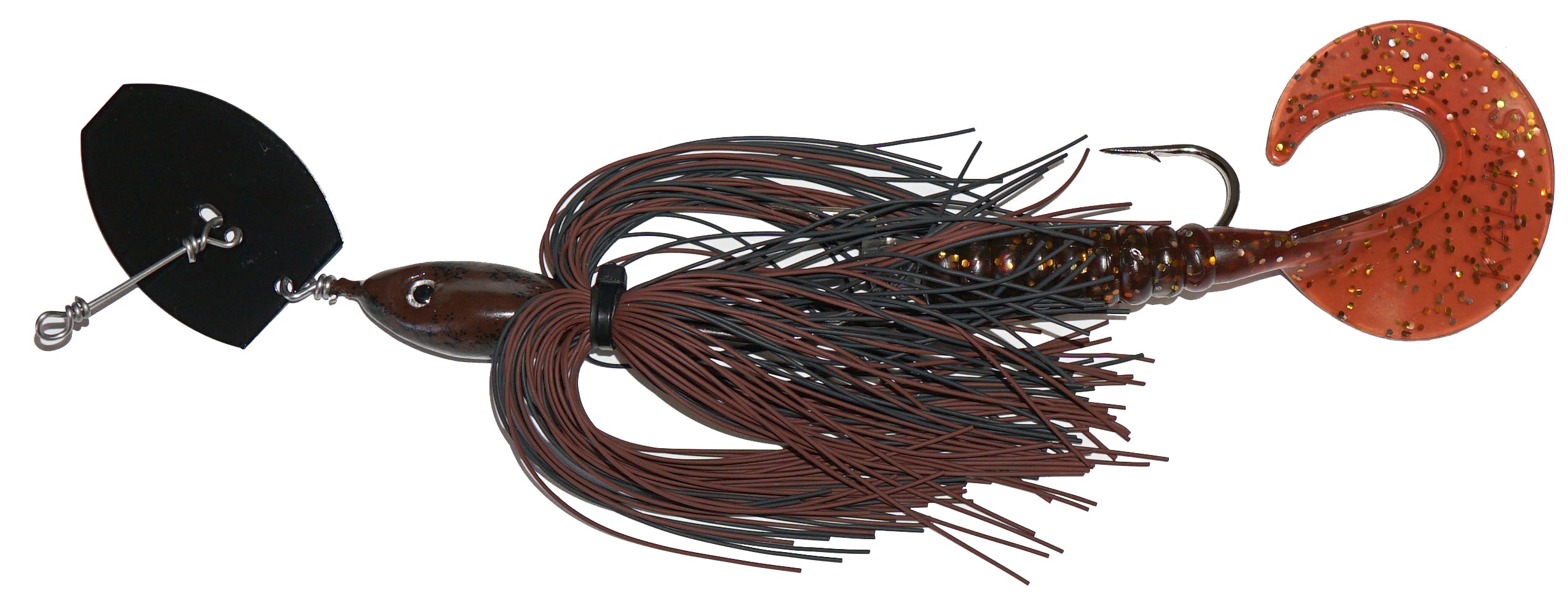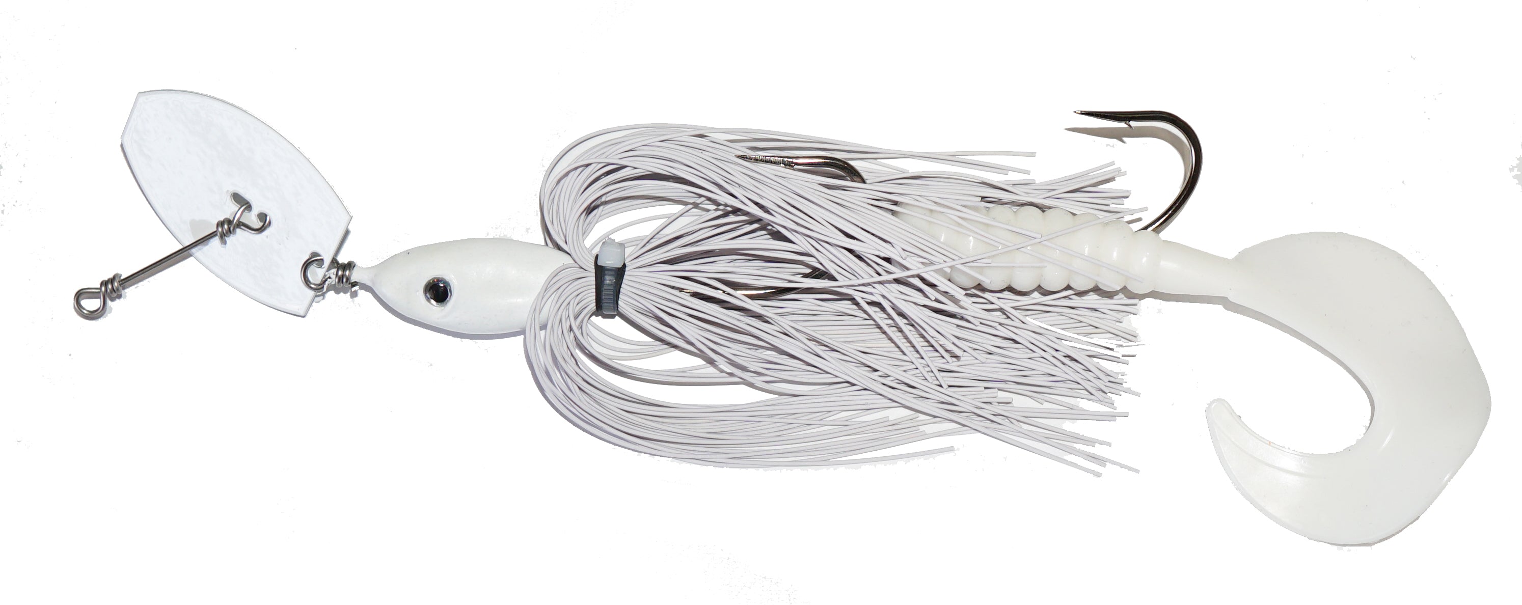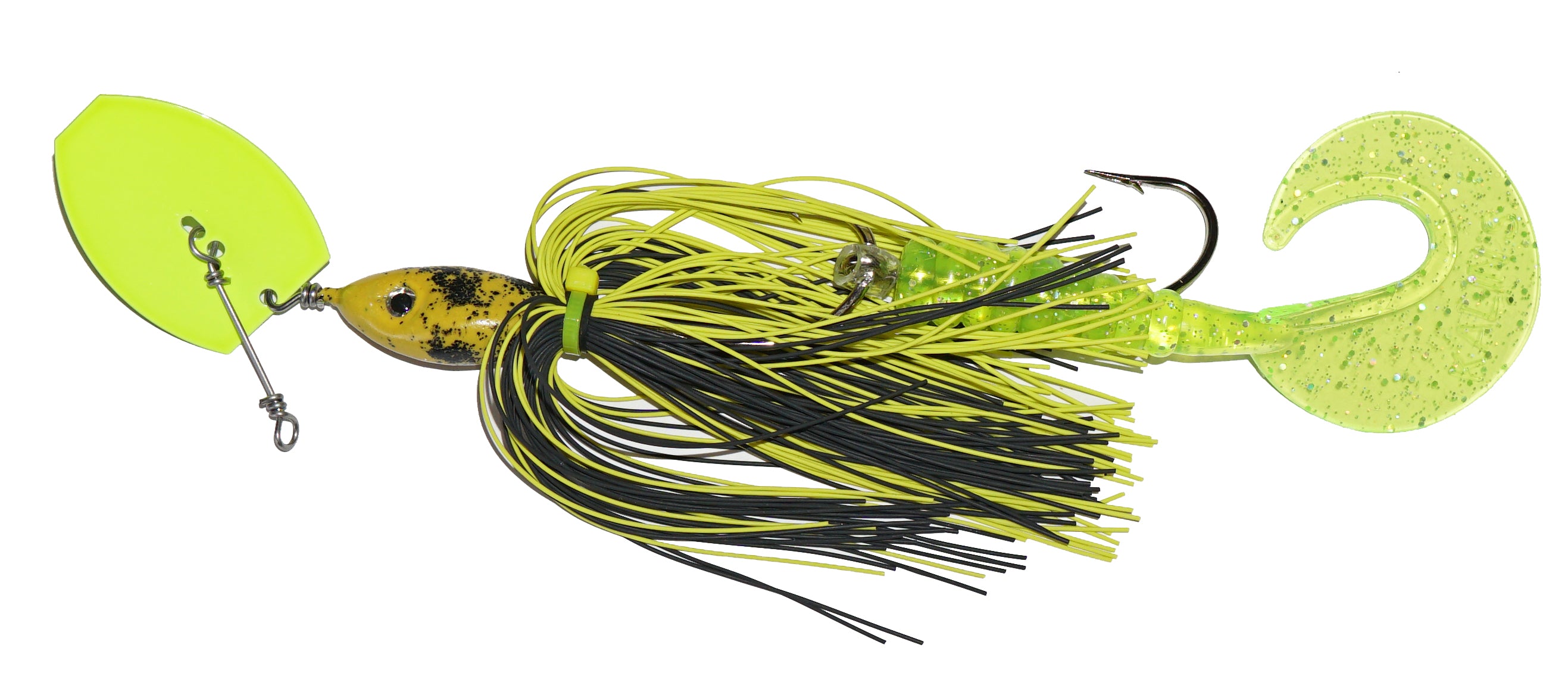 Chatter bait performance with very weedless qualities. Two single hooks, silicone skirt and a soft curly tail.