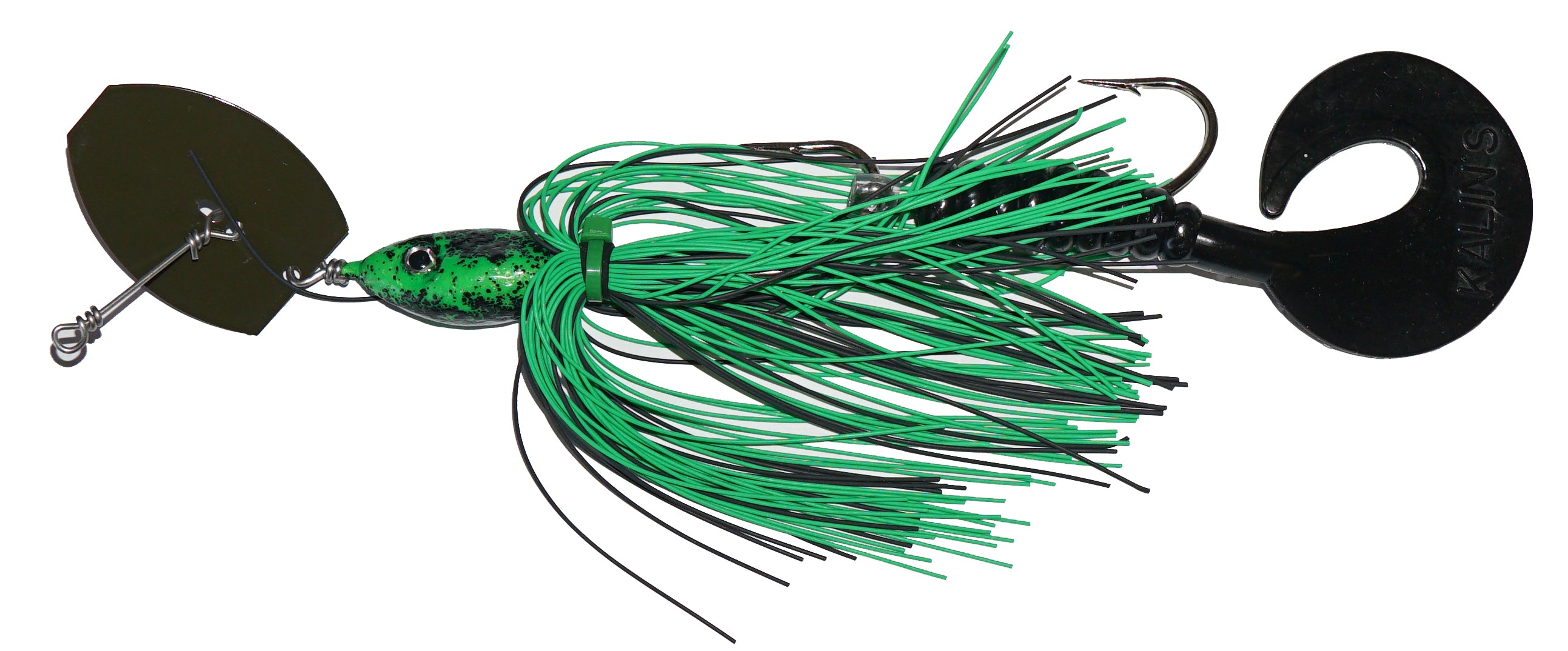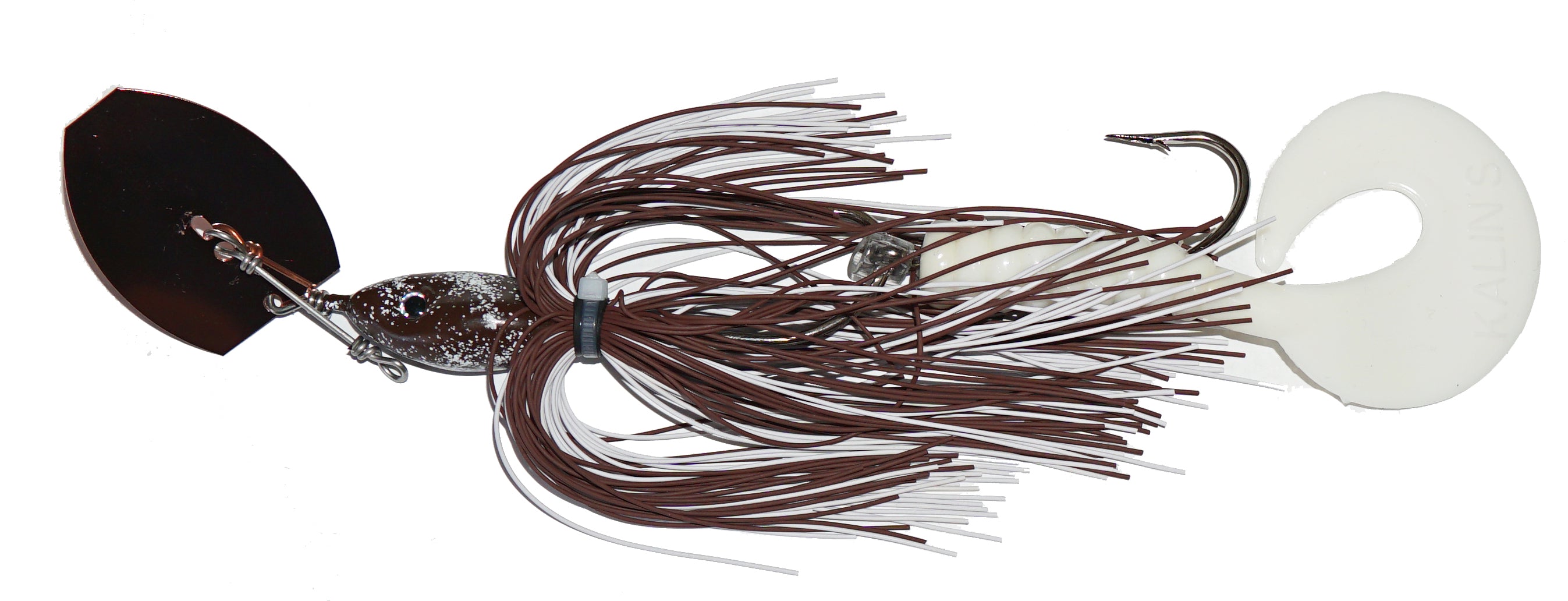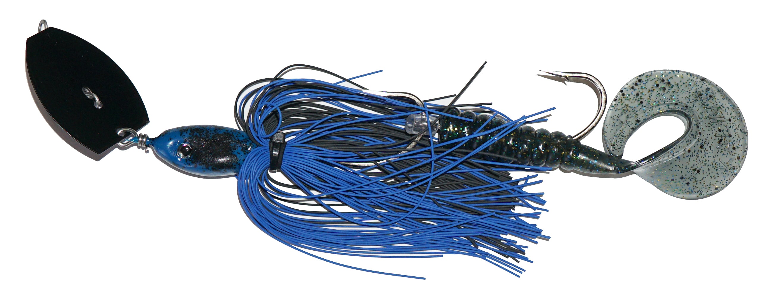 Chatter bait performance with very weedless qualities. Two single hooks, silicone skirt and a soft curly tail.